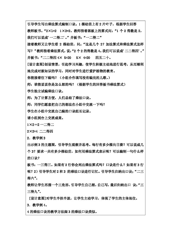 教师板书。“2XXXXXl=2 1XXXXX2=2。教师指着黑板上的算式问:“1个2得数是2,我们可以说成'一二得二'。”并板书:“一二得二”