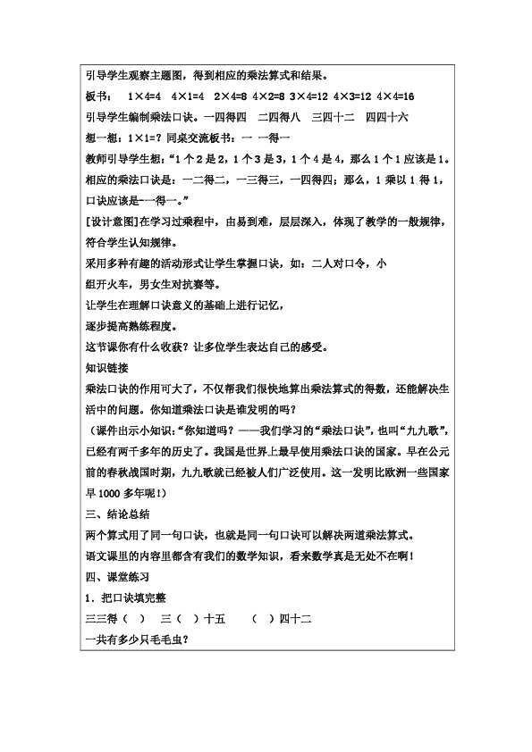 (课件出示小知识:“你知道吗?——我们学习的“乘法口诀”,也叫“九九歌”,已经有两千多年的历史了。我国是世界上最早使用乘法口诀的国家。早在公元前的春秋战国时期,九九歌就已经被人们广泛使用。这一发明比欧洲一些国家早1000多年呢!)