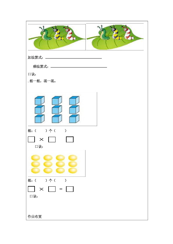 2.在已有的知识经验的基础上探索编制2、3、4的乘法口诀的方法,并初步学会利用。