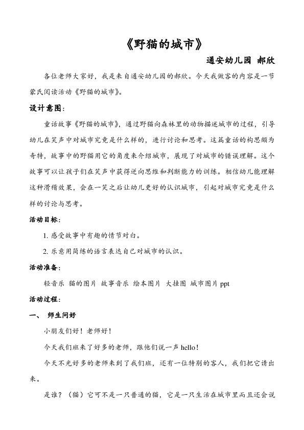 各位老师大家好,我是来自通安幼儿园的郝某某。今天我做客的内容是一节蒙氏阅读活动《野猫的城市》。