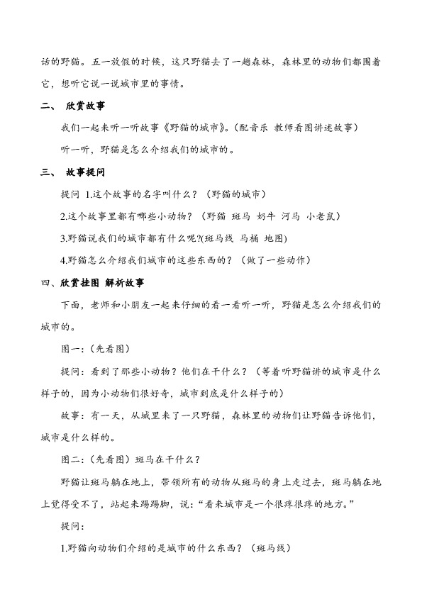 我们一起来听一听故事《野猫的城市》。(配音乐 教师看图讲述故事)