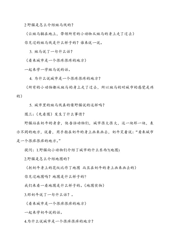 野猫站在奶牛的身旁,他告诉动物们,城市很大很大,这一块那一块,表示不同的地方,说着,用手指在奶牛的身上画来画去,奶牛笑着说:“看来城市是一个很痒很痒的地方。”