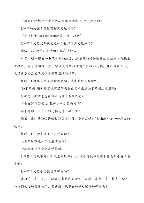 提问:看到了那些小动物?他们在干什么?(等着听野猫讲的城市是什么样子的,因为小动物们很好奇,城市到底是什么样子的)