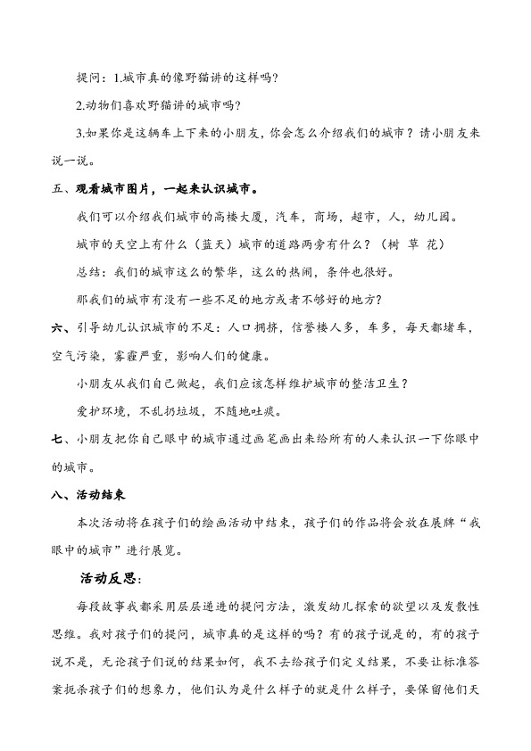 对了,城市还有一个 内容过长,仅展示头部和尾部部分文字预览,全文请查看图片预览。 提问,城市真的是这样的吗?有的孩子说是的,有的孩子说不是,无论孩子们说的结果如何,我不去给孩子们定义结果,不要让标准答案扼杀孩子们的想象力,他们认为是什么样子的就是什么样子,要保留他们天马行空的想象力。学龄前儿童正处于“读图”的年龄段,图画书对孩子的视觉震撼比知识效果更为直接。本次活动利用“视、听、讲、做”的结合法,视:提供挂图,实物让幼儿充分观察。听:教师用规范的语言描述,启发,引导,等让幼儿感知领会。讲:在感知理解的基础上,让幼儿充分表达个人的认识。做:让幼儿独立操作,进行富有创造性的语言表述。在教学当中,还可以运用表演法,让孩子们学习分角色表演,也是提高口语表现力的一种方法。谢谢大家!