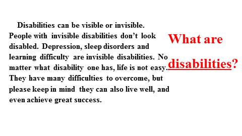 Disabilities can be visible or invisible. People with invisible disabilities don’t look disabled. Depression, sleep disorders and learning difficulty are invisible disabilities. No matter what disability one has, life is not easy. They have many difficulties to overcome, but please keep in mind they can also live well, and even achieve great success.