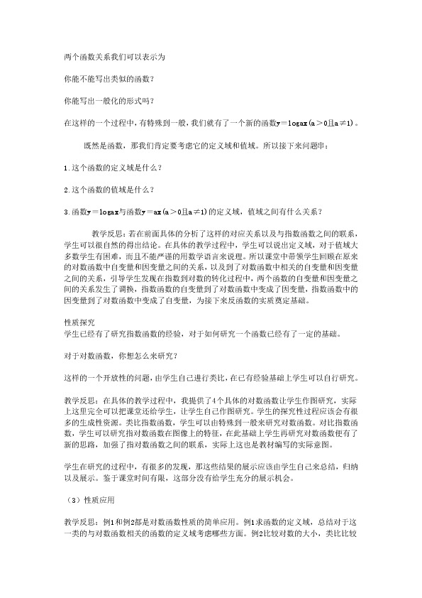??? 教学反思:若在前面具体的分析了这样的对应关系以及与指数函数之间的联系,学生可以很自然的得出结论。在具体的教学过程中,学生可以说出定义域,对于值域大多数学生有困难,而且不能严谨的用数学语言来说理。所以课堂中带领学生回顾在原来的对数函数中自变量和因变量之间的关系,以及到了对数函数中相关的自变量和因变量之间的关系,引导学生发现在指数到对数的转化过程中,两个函数的自变量和因变量之间的关系发生了调换,指数函数的自变量到了对数函数中变成了因变量,指数函数中的因变量到了对数函数中变成了自变量,为接下来反函数的实质奠定基础。