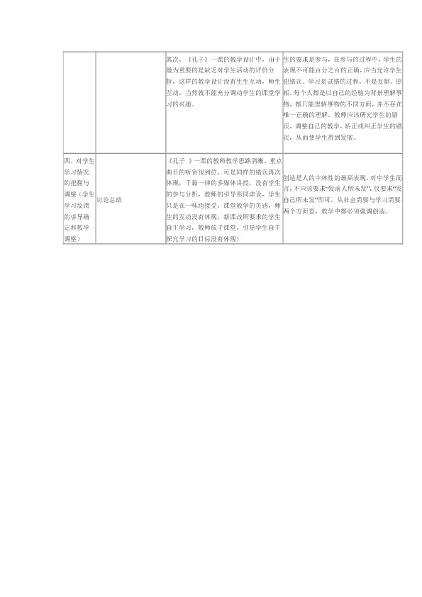 其次,《孔子》一课的教学设计中,由于最为重要的是缺乏对学生活动的评价分析,这样的教学设计没有生生互动,师生互动,当然就不能充分调动学生的课堂学习的兴趣。
