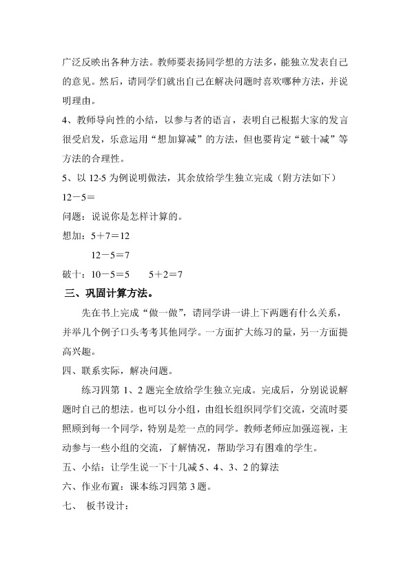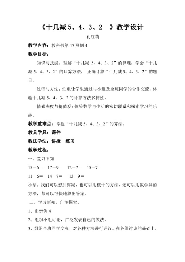 过程与方法:注重让学生通过与小组及全班同学的合作交流,体验十几减5、4、3、2的计算方法多样性。