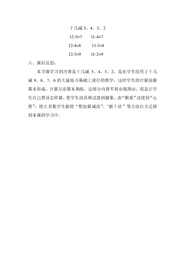 本节课学习的内容是十几减5、4、3、2,是在学生经历了十几减9、8、7、6的大量练习基础上进行的教学,这时学生的计算技能基本形成,计算方法基本熟练。这部分内容不再出现图示,而是让学生自己想该怎样算,使学生由具体过渡到抽象,由“眼观”过渡到“心想”,绝大多数学生能将“想加算减法”、“破十法”等方法自主迁移到本课的学习中。