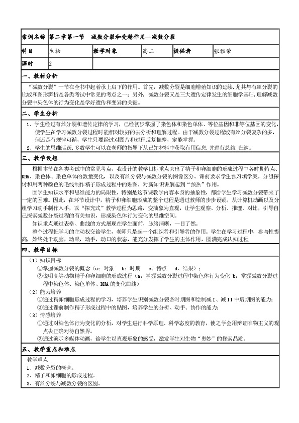 1、学生经过有丝分裂和遗传定律的学习,已经初步掌握了染色体和染色单体、等位基因和非等位基因的变化,使学生在学习减数分裂过程时能相对较好的去分析和理解过程。由于减数分裂过程较有丝分裂复杂的多,但还是有规律可循,学生只要经过对图片和过程反复揣摩,定能掌握。