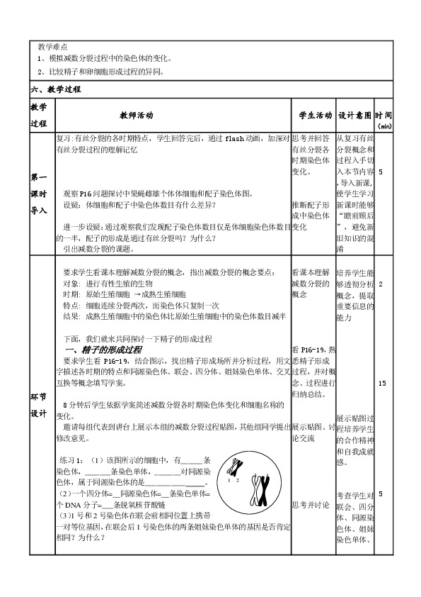 根据本节在各类考试中的常见考点,我设计的教学目标重点突出了精子和卵细胞的形成过程中各时期特点、DNA、染色体、染色单体的数量变化,以及有丝分裂与减数分裂的图像区分。课前要求学生预习填学案,分组探讨和用两种颜色的毛线制作精子形成过程中的贴图,对新知识讲解起到“预热”作用。
