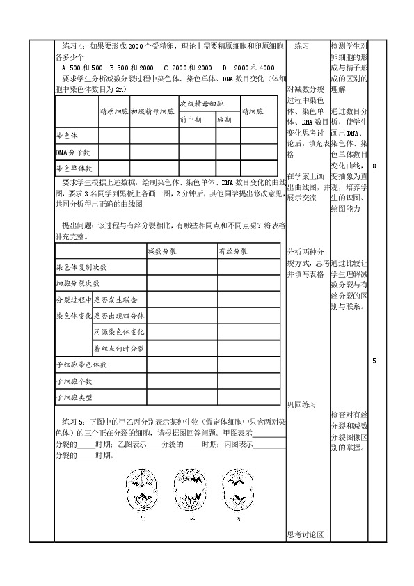 习题精选且练习的时机恰到好处,如精子形成过程后的习题,及时考察学生对减数分裂过程中染色体和DNA数目变化及图像的分析和掌握;卵细胞形成过程后的练习4,考察了一个性原细胞形成精子和卵细胞的数目差异;有丝分裂与减数分裂的比较讲解完后,及时出现的练习5,正是检测的有丝分裂和减数分裂图像区别的掌握。