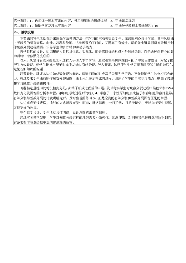 本节课的特色之处在于采用先学后教的方法,把学习的主动权交给学生。在课前精心设计学案,其中包括课上所涉及的所有表格、曲线、习题和绘图,这样既节约了时间,又提高了有效性。课前分小组共同研究分析并制作减数分裂过程贴图,培养学生的合作精神和动手能力。