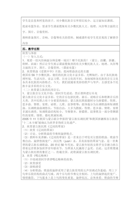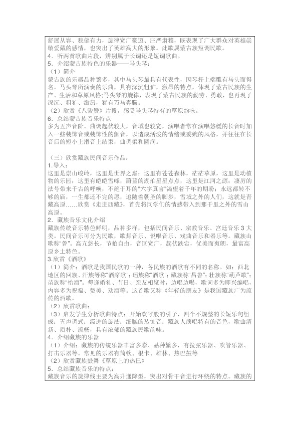 (二)欣赏蒙古族的民间音乐:1.蒙古族音乐文化介绍:可请同学先说说,然后教师进行补充
