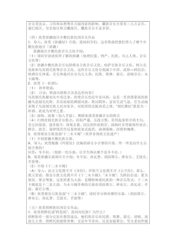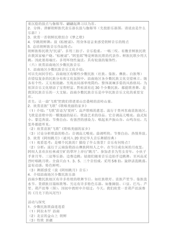 (五)欣赏朝鲜族民间音乐作品:1.欣赏朝鲜民谣“阿里郎”,提问何某某?为什么?朝鲜族有一部分定居在我国延边,他们的音乐有民歌、歌舞、器乐、说唱、戏曲五大类。朝鲜民族能歌善舞,无论年节喜庆,还是家庭聚会,男女老幼伴随着沉稳的鼓点与伽P;琴,翩翩起舞习以为常。2.分辨、讲解朝鲜族代表乐器长鼓与伽P;琴(先投影乐器图,请说出是什么乐器?)3.欣赏一首朝鲜民歌组合《梦之歌》4. 学跳朝鲜舞:放《桔梗谣》,用身体语言来感受朝鲜音乐的特点5. 总结朝鲜族音乐作品特点:朝鲜族称民歌为“民谣”。多用三拍子,音乐稳重,一唱三叹。有数首鲜族民歌在我国家喻户晓。“桔梗谣”、“阿里郎”等是鲜族民歌的代表作。鲜族民歌少用大跳,因此显得端庄,多用环绕性旋法,具有较强的装饰性。(六)欣赏西南地区少数民族音乐1.西南地区少数民族音乐文化介绍:可以先问同学们,西南地区有哪些少数民族(壮族、傣族、彝族、白族等)在错综复杂的民族分布和文化氛围中,西南地区各少数民族文化交错林立。既各有个性,又互相混融,呈现出局部单纯简约,整体斑斓多姿的风格格局,为祖国音乐文化增添了宝贵财富。黔桂滇有近30个少数民族,都能歌善舞,是我国民族音乐的一大支脉,西南少数民族音乐是中华民族音乐文化的重要宝库。首先,让一曲“飞歌”把我们带进那山峦叠嶂的苗岭山寨。2.欣赏苗族“飞歌”《歌唱美丽的家乡》(1)介绍:“飞歌”苗某某“夏某某”,高声歌唱的意思。流行于贵州东南苗族地区,飞歌是苗歌中的一颗瑰丽的钻石,歌曲艺术的珍品。它音调高亢嘹亮,曲式短小,豪迈奔放,节奏自由,有强烈的感染力。唱起来声振山谷,山鸣谷应,几里外都能听见。(2)欣赏苗族“飞歌”《歌唱美丽的家乡》(3)讨论分析歌曲的特点:音调高亢嘹亮,曲调明快,节奏自由,热情奔放。3.欣赏《阿细跳月》(被列入20世纪华人音乐舞蹈经典)(1)观看思考:是哪个民族的?描绘了什么情景?音乐有何特点?(2)分析:流行于**_*。在节日或农闲的月夜里,阿细人喜欢在松林或空旷的草坪上举行“跳月”。参加者多为男女青年,小伙子手拿月琴、三弦等乐器,边奏边某某,姑娘们随着音乐边拍手边某某舞,至兴高采烈时唱跳月歌。全曲某某1、3、5、三个音组成,采用5/8拍,旋律活泼跳荡,富有动感,特色鲜明。(3)舞蹈感受(放《阿细跳月》音乐)4.介绍西南地区少数民族乐器西南少数民族地区有许多传统的歌舞节日。如壮族歌圩、苗族芦笙节、傣族泼水节、景颇族目瑙纵歌等,另还有许多特色乐器,如象脚鼓、口弦、巴乌、芦笙、葫芦丝等(图),因初中教材中介绍过,今天,我们欣赏一首葫芦丝演奏的《月光下的风尾竹》活动与探究1.少数民族歌曲连连看(1)阿拉木某某 西南(2)北京的金某某 朝鲜(3)牧歌 新疆(4)阿瓦人民唱新歌 西藏(5)珍岛阿里郎 蒙古2.欣赏少数民族歌舞弹唱,请说出地区与乐器(1)新疆克尔克孜族 《跳吧,我的库木孜》(东不拉)(2)藏族歌舞 《欢乐的热巴》 (热巴鼓)(3)朝鲜延边族伽椰琴弹唱 《九月的金风》 (伽椰琴)(4)内蒙古好来宝 《草原儿女的心愿》 (四胡)