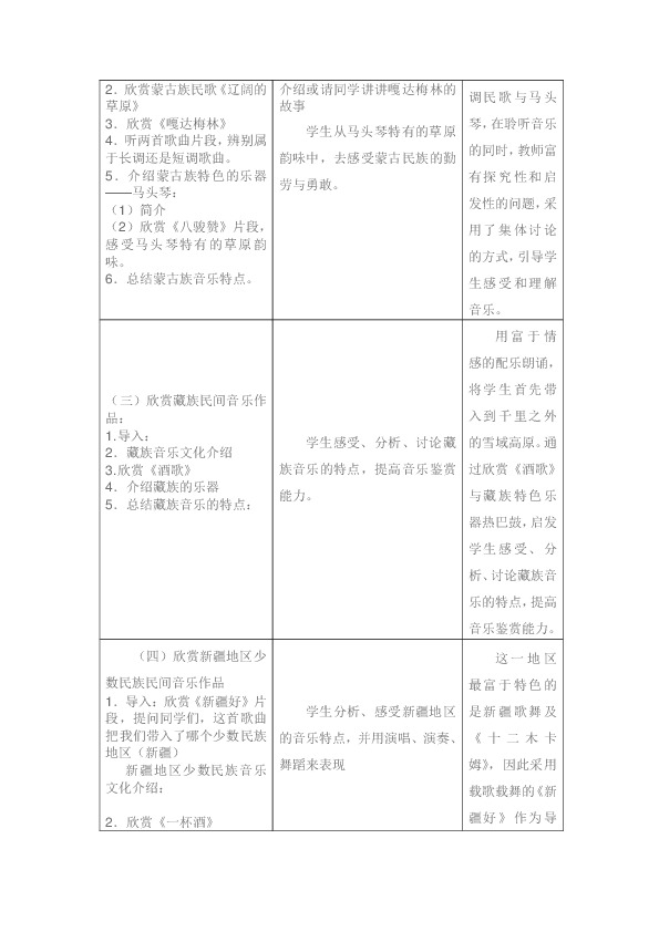 欣赏与体验(一)导入方式:1.观看一组风俗画面分辨是哪一地区?哪个民族的?(蒙古、西藏、新疆、朝鲜、西南)然后让学生展示课前搜集到的有关少数民族人文、地理、风俗等方面的文字、图片、音像资料。(课前布置)2.欣赏歌曲《爱我中华》片段,提问歌曲表达的主题我国有56个少数民族,他们的民族文化丰富多彩,光辉灿烂,由于各民族地理环境、生活风俗、语言习惯、历史文化的不同,各地域和各民族的音乐文化各具本民族的风格特点。今天,我们就随着美妙的歌声与琴声,去感受各个民族丰富多彩的音乐文化。(二)欣赏蒙古族的民间音乐:1.蒙古族音乐文化介绍:请同学先说说,然后教师进行补充蒙古族音乐文化丰富多彩,它的音乐包括民歌、器乐、说唱音乐和歌舞音乐四大类,其中民歌占有十分重要的地位。蒙古族民歌按题材分为狩猎歌、牧歌、思乡曲、赞歌、宴歌、谚歌、儿歌、叙事歌等;按体裁分为长调歌曲和短调歌曲。长调歌曲曲调悠长,节拍自由,大多为散板,牧歌、思乡曲、赞歌、宴歌多属长调类。短调歌曲结构短小,节奏整齐,狩猎歌、叙事歌及一部分带舞蹈性的宴歌、情歌、婚礼歌属短调。2005年11月我国与蒙古联合申报的“蒙古族长调民歌”和我国新疆维吾尔族的“十二木某某”被确认为世界非物质文化遗产。2.欣赏蒙古族民歌《辽阔的草原》(1)欣赏《辽阔的草原》(2)讨论、分析歌曲的节奏和旋律特点。(3)教师补充讲解:《辽阔的草原》是一首来自于呼伦贝尔盟的歌曲。歌曲节奏自由,旋律悠扬宽广、深沉隽(juan)永,具有浓郁的草原气息,是一首典型的蒙古族长调歌曲。20世纪50年代初,蒙古族年轻的女歌手宝音德力格尔带着这首歌参加世界青年联欢节,为草原人民赢得了金奖。自此,这首歌便成为蒙古族民歌的象征之一,传遍全国。此歌属蒙古族长调民歌。3.欣赏《嘎达梅某某》(1)介绍或请同学讲讲嘎达梅某某的故事:(2)欣赏感受(3)演唱感受(4)分析歌曲:歌曲的旋律采用了蒙古族常用的五声羽调式作基础,用上下句单乐段结构的曲式写成。两个乐句的节奏完全相同,上句的旋律起伏宽广,情绪激昂。下句基本上是上句的变化重复,旋律低沉。总体来看,歌曲的节奏舒展从容、稳健有力,旋律宽广豪迈、庄严肃穆,既表现了广大群众对英雄崇敬爱戴的感情,也突出了英雄高大的形象。此歌属蒙古族短调民歌。4.听两首歌曲片段,辨别属于长调还是短调歌曲。5.介绍蒙古族特色的乐器——马头琴: (1)简介蒙古族的乐器品种繁多,其中马头琴最具有代表性,因琴杆上端雕有马头而得名。马头琴所演奏的乐曲,具有深沉粗犷,激昂的特点,体现了蒙古民族的生产、生活和草原风格;马头琴的旋律,表现了蒙古民族的勤劳、勇敢,也再现了深沉、粗犷、激昂,犹有万马奔腾。(2)欣赏《八骏赞》片段,感受马头琴特有的草原韵味。6.总结蒙古族音乐特点多为五声音阶。曲调起伏较大,音域也较宽,演唱者常在演唱悠缓的长音时加入一些装饰音或装饰性的颤音,以造成活泼的情绪或委婉的风格,并往往在长音后的短小上滑音上结束,曲调柔和圆润。(三)欣赏藏族民间音乐作品:1.导入: 这里是崇山峻岭,这里是世界之巅;这里有苍苍森林,茫茫草原,这里是动植物的乐园;这里有皑皑雪峰,蔚蓝的湖泊星星点点,这里是江河之源;凄厉的法号带来千古的呼唤,不绝于耳的"六字真言"渴望着千年的期盼;永远都转不够的庙,一生都还不完的愿,追随着朝圣的脚步,雪域之外的人们,这就是青藏高原XXXXXXXXXX欣赏《走进西藏》,首先将同学们的情感带入到那千里之外的雪山高原。2.藏族音乐文化介绍藏族传统音乐特色鲜明,品种多样,包括民间音乐、宗教音乐、宫廷音乐3大类。民间音乐可分为民歌,歌舞音乐、说唱音乐、戏曲音乐和器乐等。藏族山歌称“鲁”。高亢悠长,节拍自由,音区宽广,起伏跌宕,优美而爽朗,最富高原乡土特色。3.欣赏《酒歌》(1)简介:酒歌是我国民歌的一种,各民族的酒歌有不同的名称。如:西北地区的回族、汗族等称“酒席歌”;瑶族称“酒歌”;藏族称“昌鲁”;壮族称“葫芦歌”;苗族称“恰酒”。每逢婚礼、节日、亲友相聚时,边唱边某某,歌词多为即兴编唱,内容多为祝福、赞美、劝酒等。这首歌又称《年轻的朋友》是我国藏族广为流传的酒歌。(2)欣赏歌曲:(3)启发学生分析歌曲特点:开始欢呼般的引子,四个不规整的长短乐句组成;五声调式;级进的旋法;细腻的装饰音;藏族人演唱特有的音色,歌曲清新、质朴、流畅,具有浓郁的藏族民歌韵味。4.介绍藏族的乐器(1)介绍:藏族的传统乐器丰富多彩、品种繁多,有拉弦乐器、吹管乐器、打击乐器等。常见的乐器有筒钦、根卡、雄林、热巴鼓等(2)欣赏藏族鼓舞《草原上的热巴》5.总结藏族音乐的特点:藏族音乐的旋律线主要为高升递降型,突出对骨干音进行环绕的特点。藏族的音乐受语言、习俗和宗教等多方面因素的影响。藏族音乐主要有三大方言区,康巴地区、安多地区和卫藏地区,藏族音乐丰富多彩。 (四)欣赏新疆地区少数民族民间音乐作品1.导入:欣赏《新疆好》片段,提问同学们,这首歌曲把我们带入了哪个少数民族地区(新疆) 新疆地区少数民族音乐文化介绍:(1)请同学说说你所了解的新疆(地理位置、物产、民族、风土人情、音乐文化等)(2)新疆少数民族音乐包括维吾尔族音乐文化、哈萨克族音乐文化、柯尔克孜族和乌
