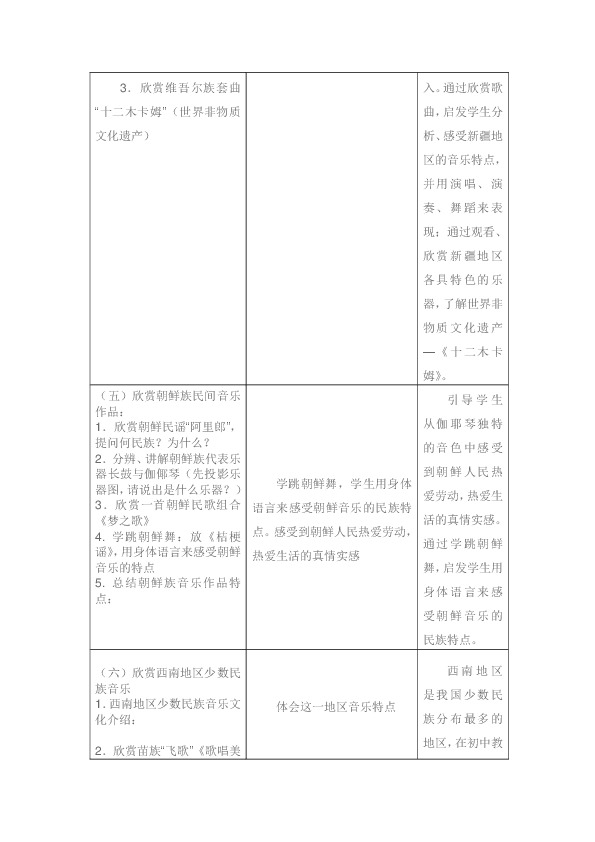 引导学生从伽耶琴独特的音色中感受到朝鲜人民热爱劳动,热爱生活的真情实感。 通过学跳朝鲜舞,启发学生用身体语言来感受朝鲜音乐的民族特点。