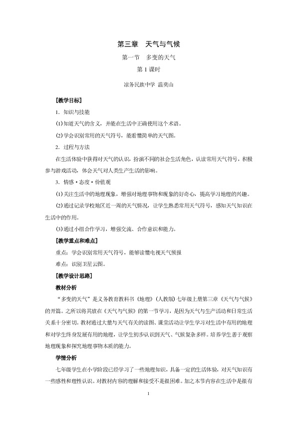 以下为《第三章 第一节 多变的天气(第1课时)教学设计》的无排版文字预览,完整格式请下载