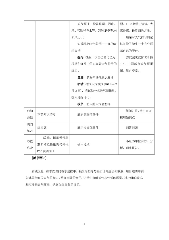 实践反思:在本次课的教学过程中,我始终坚持与我们日常生活相联系,用身边的事例告述同学有关天气的知识。结合实际的例子,让学生理解天气与气候的区别。以小组的形式,相互播报天气预报,达到加深印象的目的。