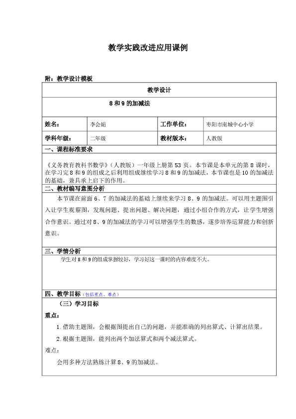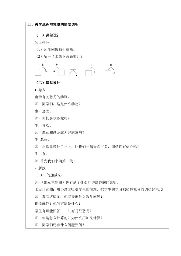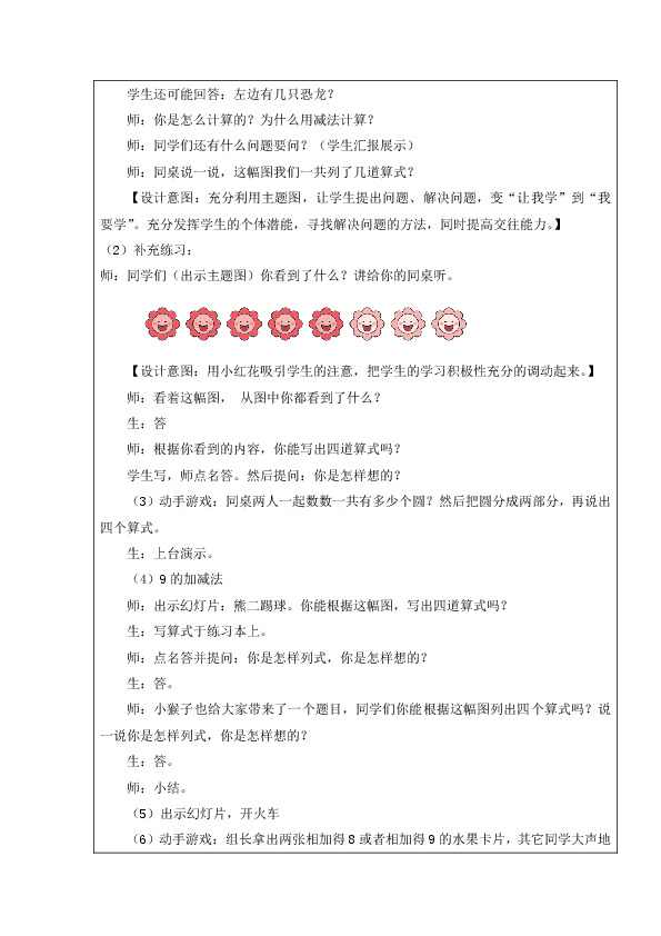 本节课在前面6、7的加减法的基础上继续来学习8、9的加减法。可以用主题图引入让学生观察图,发现问题、提出问题、解决问题,通过小组合作的方式,让学生增强合作意识。通过对8、9的加减法的学习可以增强学生的数感,逐步培养运算能力和创新意识。