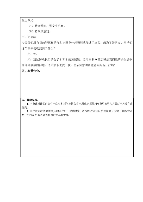 师:通过游戏我们学会了8和9的加减法,运用8和9的加减法我们能解决生活中的许许多多的问题,请大家下去找一找,然后回家讲给爸爸妈妈听,好吗?