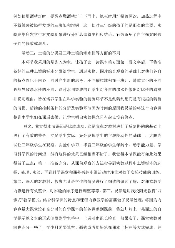 ??总之,我觉得本节课还是比较成功,这是我在对教材进行了反复斟酌的基础上进行了有效的整合,立足学生实际,充分发挥学生的主观能动性的基础上,大胆尝试让三年级学生在观察、实验中学习,毕竟三年级的学生年龄小、动手能力差、学习科学课的时间短,能有这样的效果已经相当不错了。我觉得本节课能有如此效果得益于三点:第一,准备充分,从课前观察的方法指导到实验过程中土壤标本的选择、处理、实验,再到科学课堂和课外兴趣小组活动时注重对孩子实验技能的训练。第二,深入的对教材、教参尤其是学生的情况进行了细致的研读了解,对课堂教学内容进行有效整合,对实验的顺序进行调整等等。第三,灵活运用我校阳光教育“四步式”教学模式,结合科学课的特点和课程内容教学的需要做了灵活处理,将因为内容容量大课堂没有充分时间自学课本的任务调整到课前,将幻灯片上一晃而过的自学提示以文本的形式印发到学生手中,上课前由组长检查,效果实了,课堂实验时间也充分一些了,学生只需要填空、画钩或者用铅笔在课本上标注等方式完成,并没有因此给加重学生加重多少负担。美中不足的是由于深入到学生中间去组织学生讨论、汇报交流,加之没有遥控器远距离操控一体机,导致个别地方幻灯片文本的呈现没能同步。