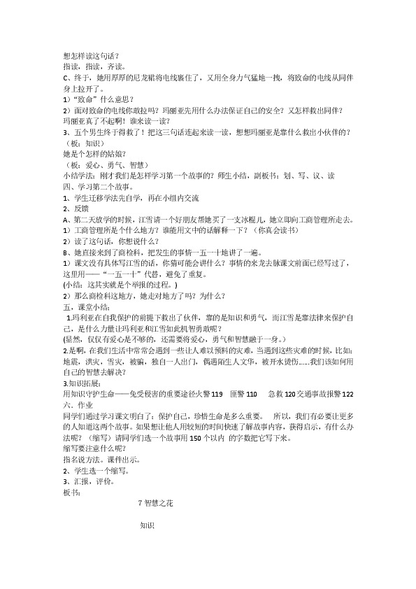 1、教学重点:懂得要将爱心、勇气、智慧融于一身,才能安全自救的道理。用150以内的字数进行缩写。