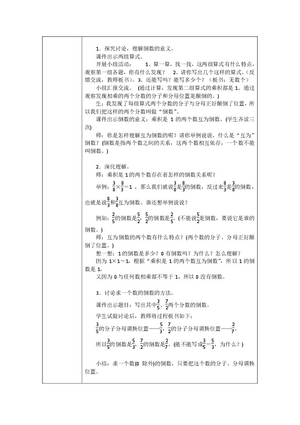 师:你是怎样理解互为倒数的呢?请你举例说说,什么是“互为”倒数?(倒数是指两个数之间的关系,这两个数相互依存,一个数不能叫倒数。)
