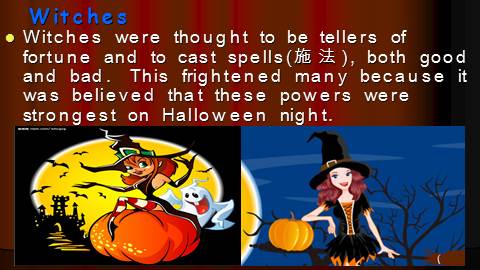 Witches were thought to be tellers of fortune and to cast spells(施法), both good and bad. This frightened many because it was believed that these powers were strongest on Halloween night.