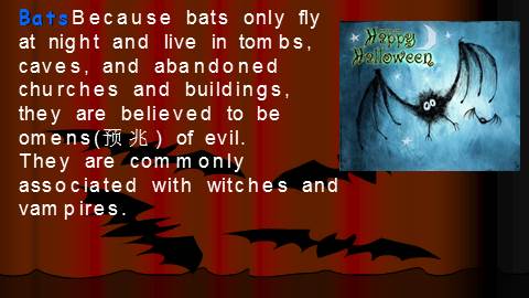 BatsBecause bats only fly at night and live in tombs, caves, and abandoned churches and buildings, they are believed to be omens(预兆) of evil.