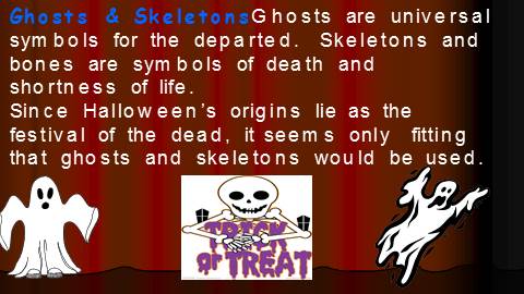 Ghosts & SkeletonsGhosts are universal symbols for the departed. Skeletons and bones are symbols of death and shortness of life.