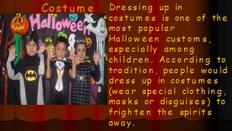 Dressing up in costumes is one of the most popular Halloween customs, especially among children. According to tradition, people would dress up in costumes (wear special clothing, masks or disguises) to frighten the spirits away.