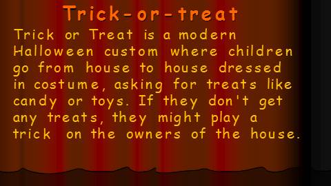 Trick or Treat is a modern Halloween custom where children go from house to house dressed in costume, asking for treats like candy or toys. If they don't get any treats, they might play a trick on the owners of the house.