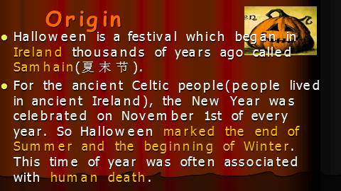 Halloween is a festival which began in Ireland thousands of years ago called Samhain(夏某某).
