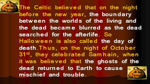 The Celtic believed that on the night before the new year, the boundary between the worlds of the living and the dead became blurred as the dead searched for the afterlife. So Halloween is also called the day of death.Thus, on the night of October 31st, they celebrated Samhain, when it was believed that the ghosts of the dead returned to Earth to cause mischief and trouble.