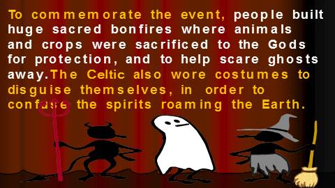 To commemorate the event, people built huge sacred bonfires where animals and crops were sacrificed to the Gods for protection, and to help scare ghosts away.The Celtic also wore costumes to disguise themselves, in order to confuse the spirits roaming the Earth.