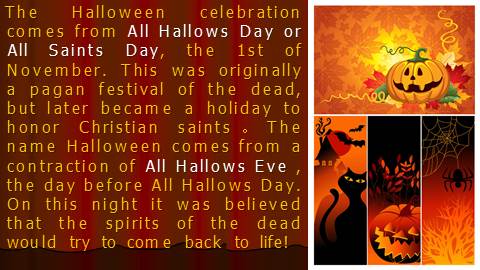 The Halloween celebration comes from All Hallows Day or All Saints Day, the 1st of November. This was originally a pagan festival of the dead, but later became a holiday to honor Christian saints。The name Halloween comes from a contraction of All Hallows Eve , the day before All Hallows Day. On this night it was believed that the spirits of the dead would try to come back to life!