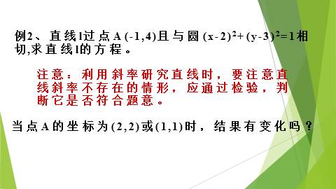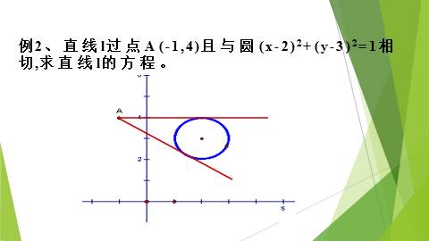 例2、直线l过点A(-1,4)且与圆(x-2)2+(y-3)2=1相 切,求直线l的方程。