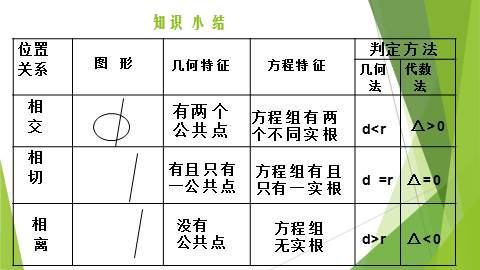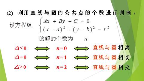 (2)几何方法,由圆心到直线的距离d与半径r的关系判断。