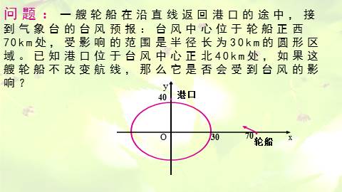 问题:一艘轮船在沿直线返回港口的途中,接到气象台的台风预报:台风中心位于轮船正西70km处,受影响的范围是半径长为30km的圆形区域。已知港口位于台风中心正北40km处,如果这艘轮船不改变航线,那么它是否会受到台风的影响?
