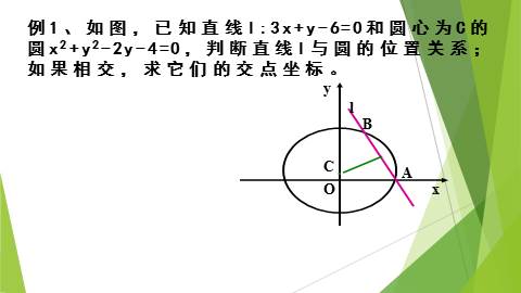 例1、如图,已知直线l:3x+y-6=0和圆心为C的圆x2+y2-2y-4=0,判断直线l与圆的位置关系;如果相交,求它们的交点坐标。