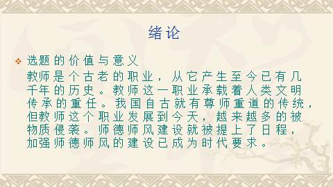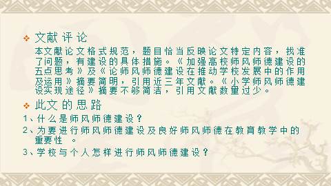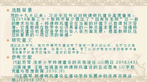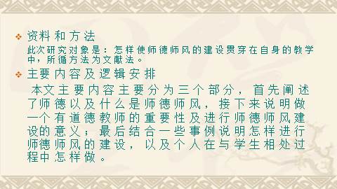 此次研究对象是:怎样使师德师风的建设贯穿在自身的教学中,所循方法为文献法。