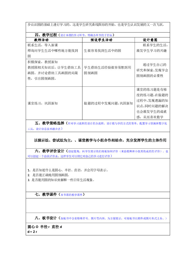 1、是否知道什么是圆心、半径、直径,并会用字母表示。