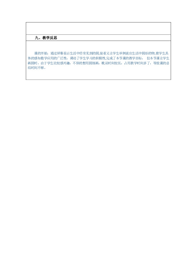 课的开始,通过屏幕显示生活中经常见到的圆,接着又让学生举例说出生活中圆形的物,使学生具体的感知数学应用的广泛性,调动了学生学习的积极性,完成了本节课的教学目标,??但本节课让学生画圆时,由于学生比较感兴趣,不停的想用圆规画,耽误时间较长,占用教学时间多了,导致课的总结时间不够。