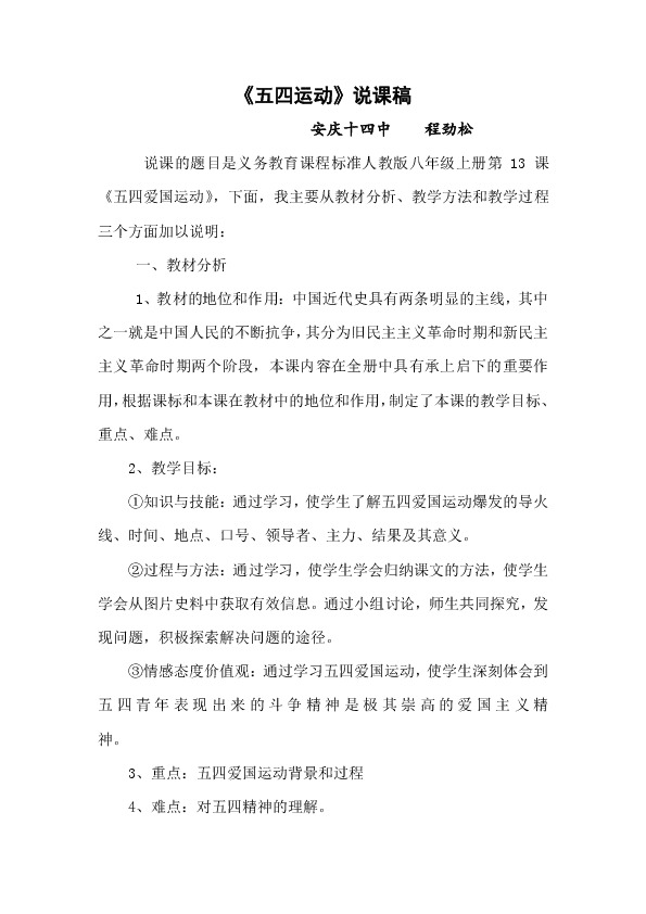 说课的题目是义务教育课程标准人教版八年级上册第13课《五四爱国运动》,下面,我主要从教材分析、教学方法和教学过程三个方面加以说明:
