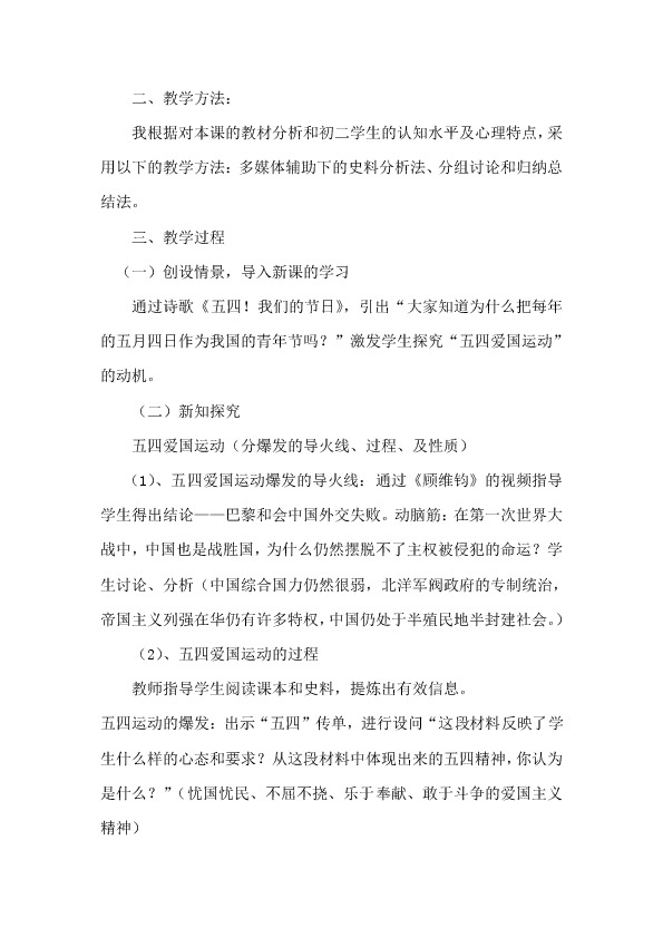 ②过程与方法:通过学习,使学生学会归纳课文的方法,使学生学会从图片史料中获取有效信息。通过小组讨论,师生共同探究,发现问题,积极探索解决问题的途径。 ③情感态度价值观:通过学习五四爱国运动,使学生深刻体会到五四青年表现出来的斗争精神是极其崇高的爱国主义精神。 ????