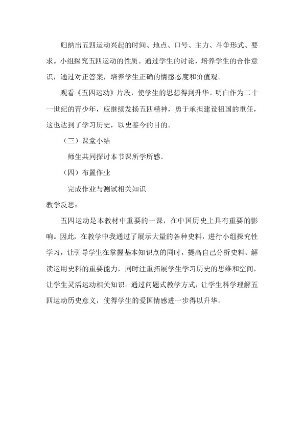 观看《五四运动》片段,使学生的思想得到升华。明白作为二十一世纪的青少年,应继续发扬五四精神,勇于承担建设祖国的重任,这也达到了学习历史,以史鉴今的目的。?