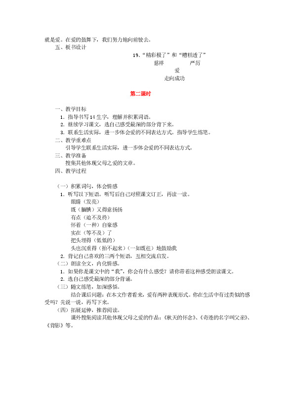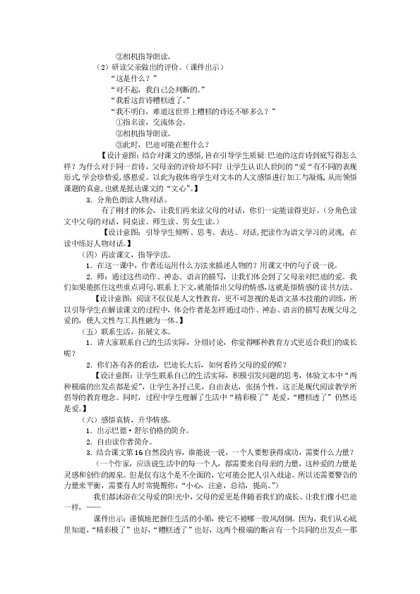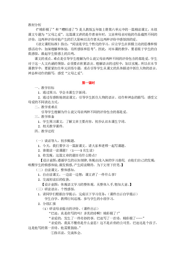 教材分析 《“精彩极了”和“糟糕透了”》是人教版五年级上册第六单元中的一篇精读课文,本组课文专题为“父母之爱”。这篇课文讲的是作者童年时,父亲和母亲对他的作品截然不同的评价,这两种评价对他产生的巨大影响以及作者从这两种评价中感悟到的爱。 《语文课程标准》指出:“阅读是学生个性化的学习,应让学生在积极主动的思维和情感活动中,加深理解和体验,有所感悟和思考”。因此,对本课的教学,要着眼于学生的自我感悟,激起学生情感上的共鸣。 课文的重点、难点是引导学生理解为什么说父母亲两种不同的评价包含的都是爱。学生对于这一人文内涵的领悟,必须要在积累语言、理解语言的过程中,加以实现。所以在本节课教学中,要紧紧扣住单元训练专题,重点引导学生从课文的具体描述中抓住人物的语言、神态和动作的描写,感受“父母之爱”。 第一课时 一、教学目标 1.通过预习,学会本课生字新词。 2.通过有感情地朗读课文,引导学生抓住人物的语言、动作和神态的描写,感受父母爱的不同表达方式。 二、教学重难点 引导学生理解为什么说父母亲两种不同的评价包含的都是爱。 三、教学准备 1.学生预习课文,了解文章主要内容,初步认识本课生字词。 2.相关教学课件。 四、教学过程 (一)谈话导入,初步揭某某。 1.今天,我们要学习一篇新课文。请大家和老师一起写课题。 2.谁能读一读课题?(1——3名生读) 3.你发现,这篇文章的题目有什么特点? 【设计意图:遵循学生的认知规律,体现由浅入深的学习进程, 由他们自己的发现,唤醒学生的情感体验,激发情感,产生阅读期待。为下文埋下伏笔。】 (二)自读课文,整体感知。 1.自由读课文,一边读一边想:课文讲了一件什么事? 2.交流初读后的收获。 【设计意图:体现语文学习的整体观。从整体入手,粗知大意。】 (三)研读语言,个性感悟。 1.请同学们根据自学提示,完成以下学习任务:(课件出示自学提示) 学生自学,教师行间巡视,参与学生的小组学习。 2.分组汇报 (1)研读母亲做出的评价。(课件出示) “巴迪,真是你写的吗?多美的诗啊!精彩极了!” “亲爱的,发生了一件奇妙的事。巴迪写了一首诗,精彩极了XXXXXXXXXX” “亲爱的,我真不懂你是什么意思!这不是在***里。巴迪还是个孩子,这是他写的第一首诗。他需要鼓励。” ①指名读,交流体会。 ②相机指导朗读。 (2)研读父亲做出的评价。(课件出示) “这是什么?” “对不起,我自己会判断的。” “我看这首诗糟糕透了。” “我不明白,难道这世界上糟糕的诗还不够多么?” ①指名读,交流体会。 ②相机指导朗读。 ③此时,巴迪可能在想什么? 【设计意图:结合对课文的感悟,旨在引导学生质疑:巴迪的这首诗到底写得怎么样?为什么对于同一首诗,父母亲的评价却不同?让学生认识人世间的“爱“有不同的表现形式,学会珍惜爱,感恩爱。以此为载体将学生对文本的人文感悟进行加工与凝炼,从而领悟课题的真意,也就是抵达课文的“文心”。】 3.分角色朗读人物对话。 有了刚才的体会,让我们再来读父母的对话,你们一定能读得更好。(分角色读文中父母的对话,同桌读、师生读、男女生读。) 【设计意图:引导学生倾听、思考、表达、对话,把读作为语文学习的灵魂, 在读中练好人物对话。】 (四)再读课文,指导学法。 1.在这一课中,作者还运用什么方法来描述人物的?用课文中的句子说一说。 2.师:通过这些动作、神态、语言的描写,让我们体会到了父母亲对巴迪的爱。我们如果能抓住这些重点词句、联系上下文,就能悟出父母的情感,这就是悟情感的读书方法。 【设计意图:阅读不仅仅是人文性教育,更不可忽视的是语文基本技能的训练,所以引导学生在解读课文的过程中,体会作者是怎样通过动作、神态、语言的描写表现父母之爱的,使人文性与工具性融为一体。】 (五)联系生活,拓展文本。 1.请大家联系自己的生活实际,分组讨论,你觉得哪种教育方式更适合我们的成长呢? 2.你们各有各的看法,巴迪长大后,如何看待父母的爱的呢? 【设计意图:让学生联系自己的生活实际,积极引发问题的思考,体验文本中“两种极端的出发点都是爱”,让学生各抒己见,自由表达,张扬个性,这正是现代阅读教学所倡导的教育理念。同时,过程中学生理解了生活中“精彩极了”是爱,“糟糕透了”仍然还是爱。】 (六)感悟真情,升华情感。 1.出示巴德XXXXX舒尔伯格的简介。 2.自由读作者简介。 3.结合课文第16自然段某某,谁能说一说,一个人要想获得成功,需要什么力量? (一个作家,应该说生活中的每一个人,都需要来自母亲的力量,这种爱的力量是灵感和创作的源泉。但是仅有这个是不全面的,它可能会把人引入歧途。所以还需要警告的力量来平衡,需要有人时常提醒你:“小心,注意,总结,提高。”) 我们都沐浴在父母爱的阳光中,父母的爱更是伴随着我们的成长。让我们像小巴迪一样,—— 课件出示:谨慎地把握住生活的小船,使它不被哪一股风刮倒。因为,我们从心底里知道,“精彩极了”也好,“糟糕透了”也好,这两个极端的断言有一个共同的出发点—那就是爱。在爱的鼓舞下,我们努力地向前驶去。 五、板书设计 19、“精彩极了”和“糟糕透了” 慈祥 严厉 爱 走向成功 第二课时 一、教学目标 1.指导书写14生字,理解并积累词语。 2.继续学习课文,选自己感受最深