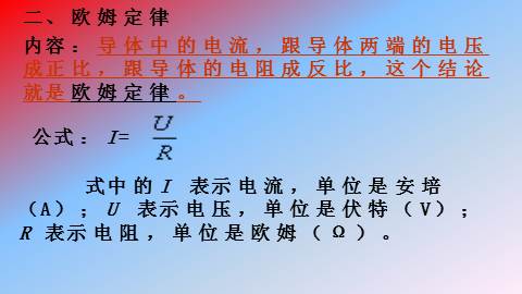 内容:导体中的电流,跟导体两端的电压成正比,跟导体的电阻成反比,这个结论就是欧姆定律。