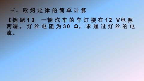 【例题1】 一辆汽车的车灯接在12 V电源两端,灯丝电阻为30 XXXXX,求通过灯丝的电流。